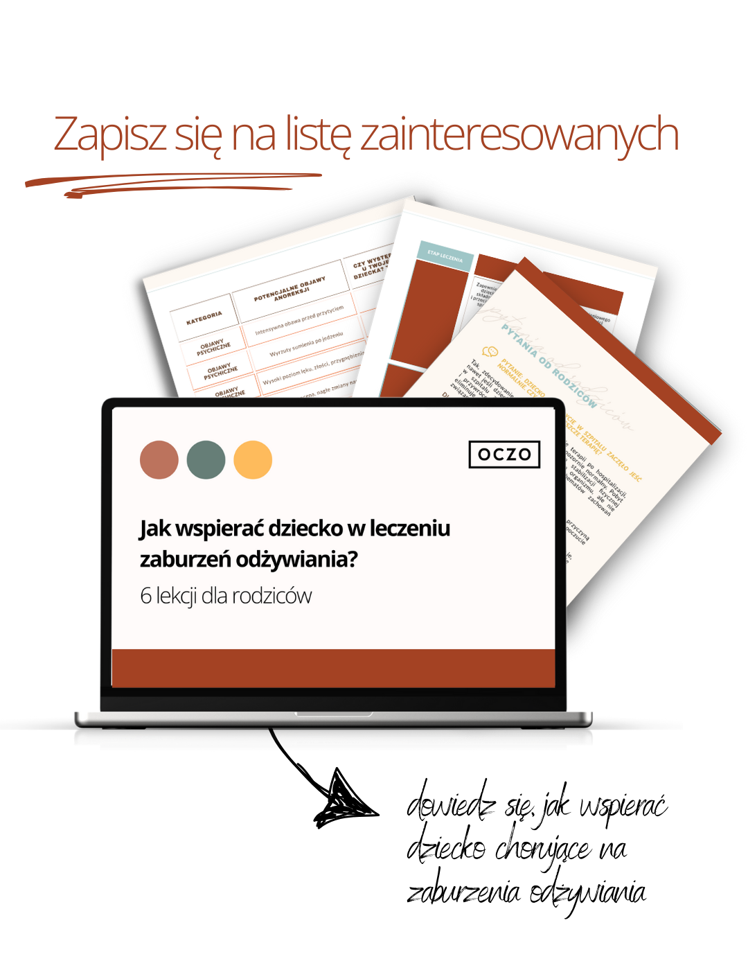 Wpisz swój e-mail poniżej, by zapisać się na listę zainteresowanych kursem on-line „Jak wspierać dziecko w leczeniu zaburzeń odżywiania? 6 lekcji dla rodziców”. Dzięki temu my będziemy mogli być z Tobą w kontakcie i informować Cię na bieżąco o postępach. Twój adres e-mail jest bezpieczny. Nie spamujemy. Wypisać możesz się w każdej chwili.